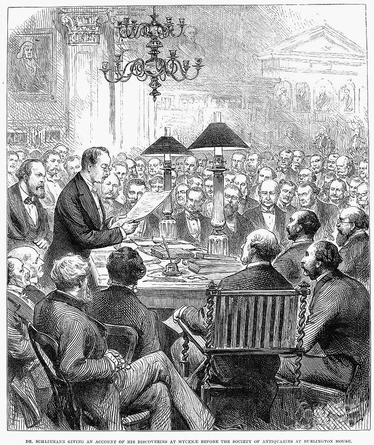 Ο Ερρίκος Σλήμαν μιλώντας σε ακροατήριο στο Λονδίνο για τις ανασκαφές που πραγματοποίησε στις Μυκήνες. H ομιλία έγινε στο Burlington House στην Πλατεία Piccadilly, στην Εταιρία Αρχαιοτήτων του Λονδίνου, (από Αγγλική εφημερίδα της εποχής). Αρχείο: Κώστας Καράπαυλος.