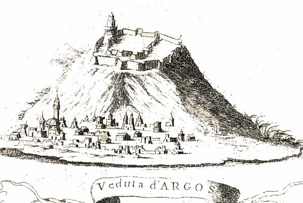 Άργος (Arhoz, Erhoz) 1668 – Εβλιγιά Τσελεμπή » Argos, Coronelli, «Morea, Negreponte, e Adiazenze», Venezia, 1685
