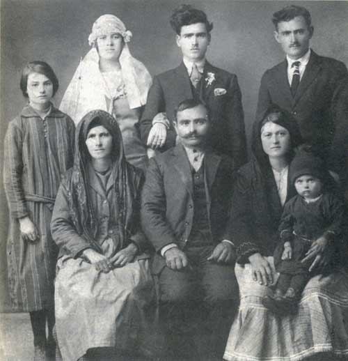 Αναμνηστική νυφική φωτογραφία, όπου ξεχωρίζουν τρεις τύποι αμφίεσης. Οι καθστές γυναίκες με ντόπια φορέματα, η στολή της νύφης και οι «φραγκοφορεμένοι» άντρες με το γαμπρό.