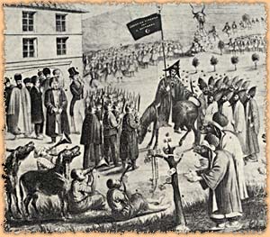 Λιθογραφία της εποχής που εκφράζει την αποδοκιμασία από την ελληνική κοινή γνώμη της συνθήκης φιλίας και εμπορίου με την Οθωμανική Αυτοκρατορία.