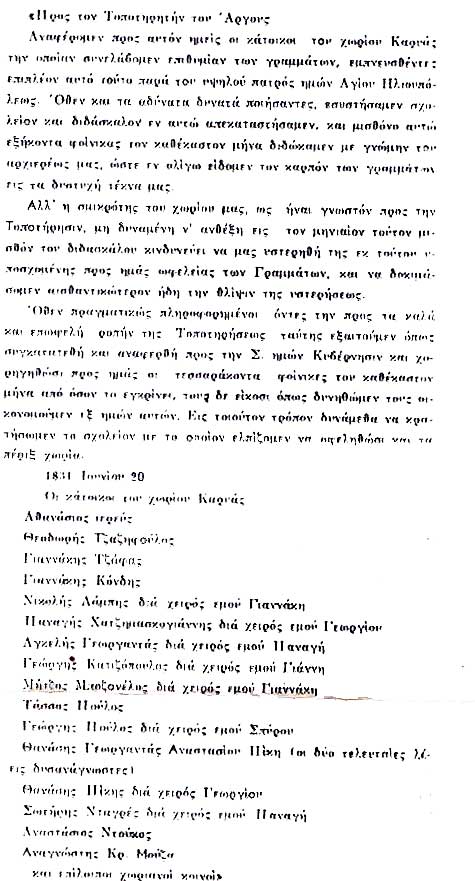 Δημοτικό Σχολείο Καρυάς Άργους (1831-2003) » Επιστολή κατοίκων, 20 Ιουνίου 1831.