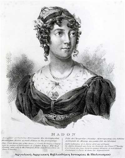 Πορτρέτο της «Ηρωίδας της Μυκόνου» Μαντώς Μαυρογένους, έργο του Adam Friedel. Λιθογραφία, Λονδίνο – Παρίσι, 1827.