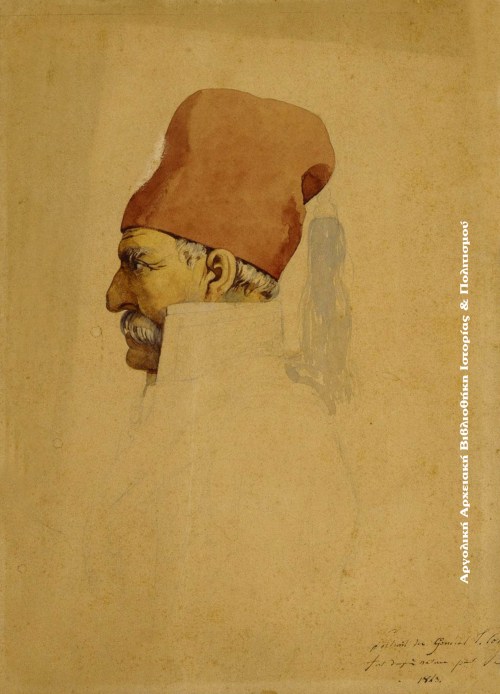 Πορτρέτο του Θεόδωρου Κολοκοτρώνη (1843) σχεδιασμένο εκ του φυσικού από τον Γάλλο ζωγράφο Πιερ Μπονιρότ (Pierre Bonirote, 1811-1891). Υδατογραφία και μολύβι σε χαρτί, 27,5 x 20 cm.