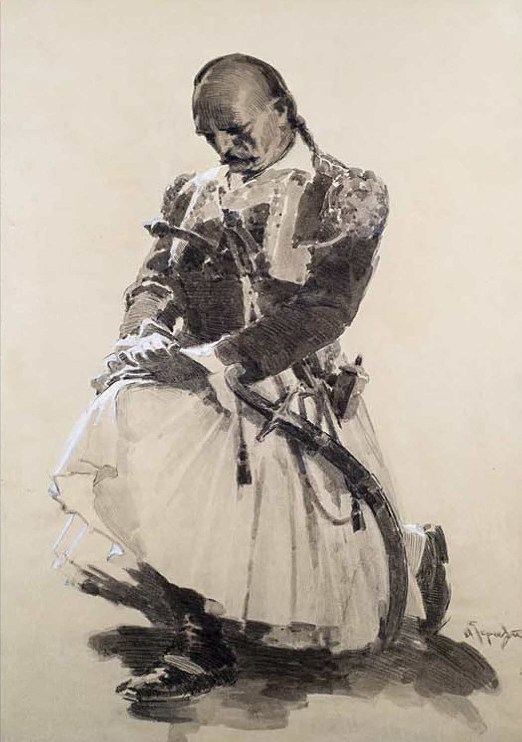 «Ο Κολοκοτρώνης προσευχόμενος». Υδατογραφία του Αποστόλου Γεραλή (1886-1983). Πολεμικό Μουσείο.