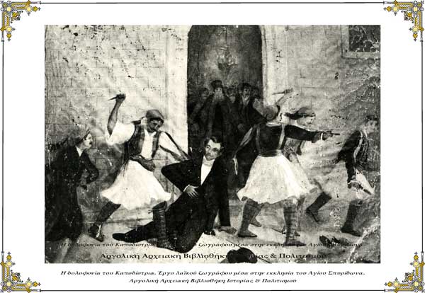 Το Ναύπλιο την ημέρα της δολοφονίας του Καποδίστρια » Η δολοφονία του Καποδίστρια. Έργο λαϊκού ζωγράφου μέσα στην εκκλησία του Αγίου Σπυρίδωνα.