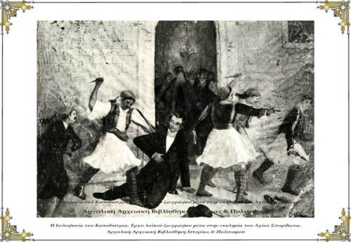 […] Οι Μαυρομιχαλαίοι κατοικούσαν σε μικρή απόσταση ανατολικότερα από τον τόπο συνάντησης στην οδό Γ. Τερτσέτη, πάροδο της οδού Πλαπούτα μεταξύ της πλατείας του Αγίου Γεωργίου και της οδού Αγγέλου Τερζάκη, και είχαν βγει με κακό σκοπό, αναζητώντας πρωΐ – πρωΐ την Κυριακή τον Κυβερνήτη για ξεκαθάρισμα λογαριασμών με τον γνωστό μανιάτικο τρόπο για λόγους τιμής. Ο κυβερνήτης τους χαιρέτησε βγάζοντας το καπέλο του αμίλητος, εκείνοι ξαφνιάστηκαν και του ανταπέδωσαν σιωπηλοί τον χαιρετισμό. Στη συνέχεια ο Κυβερνήτης συνέχισε απρόσκοπτα με τους δυο συνοδούς φρουρούς του την πορεία του προς την εκκλησία, ακολουθώντας το καθιερωμένο σύντομο δρομολόγιο του κυριακάτικου εκκλησιασμού του με αργό περπάτημα συνολικής διάρκειας επτά λεπτών περίπου. Έστριψε δεξιά στην αρχή της οδού Σταϊκοπούλου και προχώρησε προς την εκκλησία. Οι Μαυρομιχαλαίοι μετά τον χαιρετισμό μέσα στο πρωινό δεν ακολούθησαν τον Κυβερνήτη, αλλά έφυγαν γρήγορα ανηφορίζοντας νότια της οδού Τερζάκη το ανηφορικό στενό με τα σκαλοπάτια, διέσχισαν στη συνέχεια τη μικρή πλατεία μπροστά από την εκκλησία και έφτασαν νωρίτερα στον Άγιο Σπυρίδωνα, όπου περίμεναν τον Κυβερνήτη στην πόρτα της εκκλησίας, όπως έκαναν και την προηγούμενη Κυριακή, αλλά ο Κυβερνήτης έγκαιρα ειδοποιημένος δεν είχε πάει στην εκκλησία…https://argolikivivliothiki.gr/2010/04/17/kapodistrias-7/