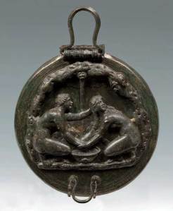 Χάλκινο πτυκτό κάτοπτρο με παράσταση λουόμενων γυναικών από την αρχαία πόλη της Επιδαύρου, β΄ μισό 3ου-2ος αι. π.Χ.