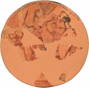 Πήλινη αναθηματική ασπίδα με παράσταση Αμαζονομαχίας από το «Βόθρο» στην Άνω Ακρόπολη της Τίρυνθας, αρχές 7ου αι. π.Χ.
