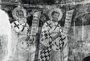 Την κόγχη του ιερού καταλαμβάνει η Πλατυτέρα και χαμηλότερα η Κοινωνία των Αποστόλων και συλλειτουργούντες Ιεράρχες. Στο κτιστό τέμπλο ψηλά είναι ζωγραφισμένοι οι Απόστολοι (Μεγάλη Δέηση) και χαμηλότερα μέσα σε αβαθείς κόγχες, ένθρονη Βρεφοκρατούσα, Χριστός Παντοκράτωρ και Ιωάννης ο Πρόδρομος.