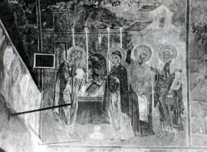 Η ημερομηνία αυτή αποτελεί και ένδειξη για τη χρονολόγηση των τοιχογραφιών, που καλύπτουν όλες τις εσωτερικές επιφάνειες και το κτιστό τέμπλο [ix]. Το εικονογραφικό πρόγραμμα ανήκει στο Χριστολογικό κύκλο. Η διακόσμηση των πλαγίων τοίχων έχει κατανεμηθή σε τρείς καθ’ ύψος ζώνες. Στην κατώτερη εικονίζονται ολόσωμοι άγιοι. Στη μεσαία, μέσα σε τετράγωνα διάχωρα που ορίζονται από βαθυκόκκινη ταινία, ένδεκα στη σειρά σκηνές από το Βίο και το Πάθος του Χριστού (από το γνωστό Δωδεκάορτο λείπει ο Μυστικός Δείπνος) και στο Α. άκρο του Β. τοίχου η Κοίμηση της Θεοτόκου.