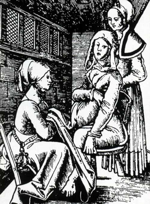 Σκηνή τοκετού από το βιβλίο του Roesslin Der Swangern Frawen und Hebammen Rosengarten (1513), που απεικονίζει μια γυναίκα καθισμένη σε καρέκλα να δέχεται τις φροντίδες δύο μαιών.
