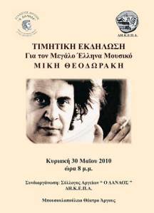 Την Κυριακή 30 Μαΐου 2010 και ώρα 8 μ.μ. ο Σύλλογος Αργείων « Ο ΔΑΝΑΟΣ» στην αίθουσα του Μπουσουλοπούλειου Θεάτρου στο Άργος, ανακηρύσσει σε ειδική εκδήλωση ΕΠΙΤΙΜΟ ΜΕΛΟΣ του, τον Μεγάλο Έλληνα και Παγκόσμιας αναγνώρισης Μουσικοσυνθέτη Μίκη Θεοδωράκη.