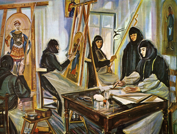 Ιερά Μονή Παμμεγίστων Ταξιαρχών Νέας Επιδαύρου » Οι μοναχές συγκεντρωμένες στο μικρό ζωγραφείο – Ντιάνα Αντωνακάτου