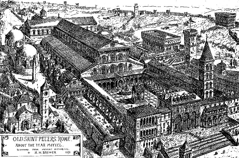 Αρχές του 4ου αιώνα, και πιο συγκεκριμένα το 324 μ.Χ. ο αυτοκράτορας Κωνσταντίνος Α΄ ο Μέγας έχτισε πάνω σε ένα πολύ μικρό μνημείο στο σημείο μαρτυρίου του Απόστολου Πέτρου μία αρκετά μεγάλη, πεντάκλιτη βασιλική. Στους επόμενους αιώνες η βασιλική υπέστη αρκετές ζημιές λόγω των συνθηκών της εποχής, και των πολλαπλών λεηλασιών. Παρόλα αυτά όμως οι Πάπες φρόντιζαν να γίνονται συχνά ανακαινίσεις.