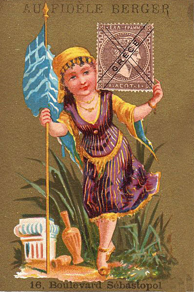 Διαφημιστική μικρή χρωμολιθόγραφη καρτολίνα με νεαρή κοπέλα που κρατάει Ελληνική σημαία & γραμματόσημο μεγάλης κεφαλής Ερμού.
