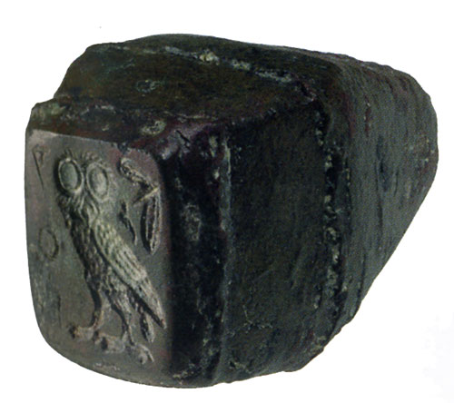 Το νόμισμα στον αρχαίο Ελληνικό κόσμο » Σφραγίδα – μήτρα με την παράσταση της γλαύκας και τα σύμβολα της πόλης των Αθηνών για την αποτύπωση παράστασης στο νόμισμα.