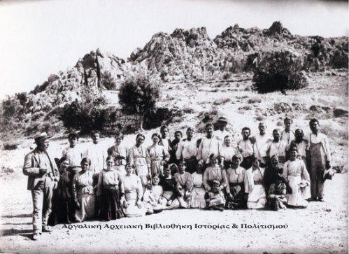 Ασίνη. Όλοι έβαλαν τα καλά τους για την ομαδική φωτογραφία. Αριστερά ο κύριος Νικόλας Γριμάνης, που ήταν φύλακας στο Μουσείο του Ναυπλίου και εργάστηκε ως προϊστάμενος των εργατών σε όλες τις ανασκαφικές περιόδους. 1922 (Αρχείο Ασίνης).