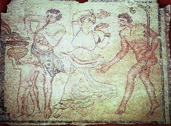 Η συμβολή του Αρχαίου Άργους στην ανάπτυξη της Μουσικής » Εικ. 20. Ψηφιδωτό δάπεδο με σκηνή χορού Σάτυρου και ορχηστρίδας.