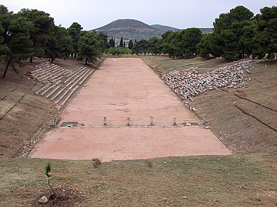 Το Στάδιο μετά την αποκατάσταση του στίβου και της νότιας πλευράς του (2005). Φωτογραφία: Επιτροπή Συντήρησης Μνημείων Επιδαύρου.