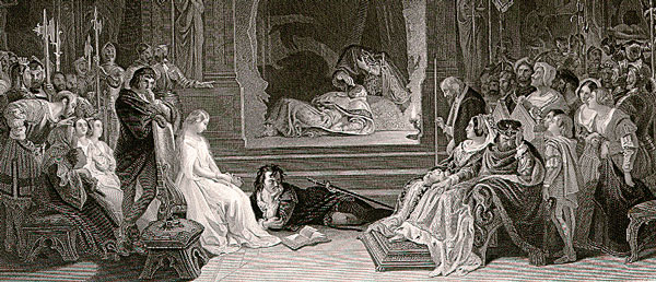 Γκραβούρα του Daniel Maclise (1842), παριστάνει την στιγμή που αποκαλύπτεται η ενοχή του Κλαύδιου.