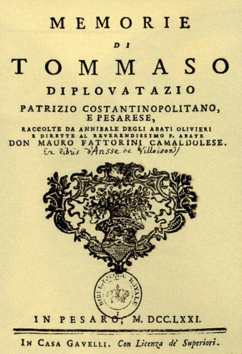 To έργο του Annibale Degli Abbati Olivieri, η πρώτη συστηματική παρουσίαση της ζωής και του έργου του Θωμά Διπλοβατάτζη, Πέζαρο, 1771.