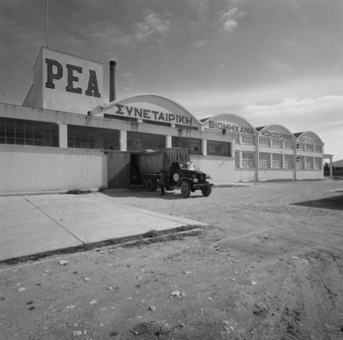 Πρόσοψη του εργοστασίου κονσερβοποιίας ΡΕΑ, 1963. Πηγή: Φωτογραφία Δ. Χαρισιάδης, Φωτογραφικό Αρχείο Μουσείου Μπενάκη.