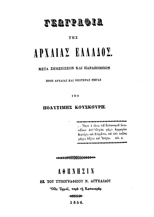 Γεωγραφία της Αρχαίας Ελλάδος. Μετά σημειώσεων και παραπομπών προς αρχαίας και νεωτέρας πηγάς. / Υπό Πολυτίμης Κούσκουρη, 1854.