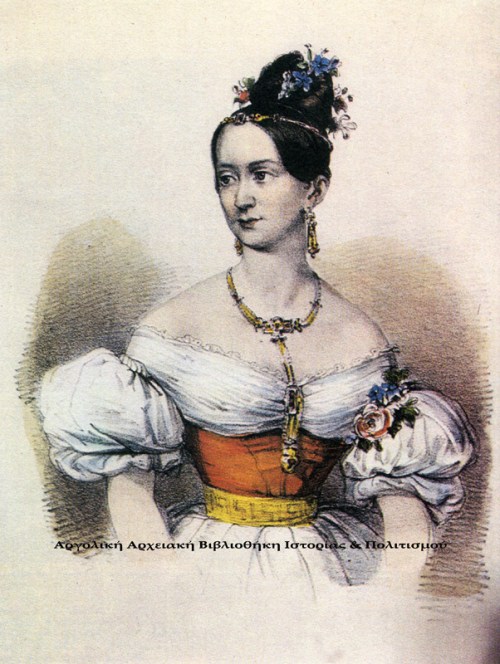 Έγχρωμη λιθογραφία που παρουσιάζει την Αμαλία πριν έρθει στην Ελλάδα.