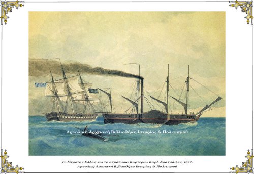Η υδατογραφία αυτή, με την αναπαράσταση των δύο ιστορικών πλοίων, ιδιαίτερα του πρώτου ατμόπλοιου του ελληνι¬κού στόλου, το «Καρτερία», εν πλω, αποκτάει ιδιαίτερο ενδιαφέρον για την τεκμηρίωσή τους. Έγινε, όπως και οι προσωπογραφίες των Αγωνιστών, εκ του φυσικού, πιθανώς στο λιμάνι του Πόρου, όπου βρισκόταν ο Κρατσάϊζεν το 1827, επιστρέφοντας προς το Μόναχο.