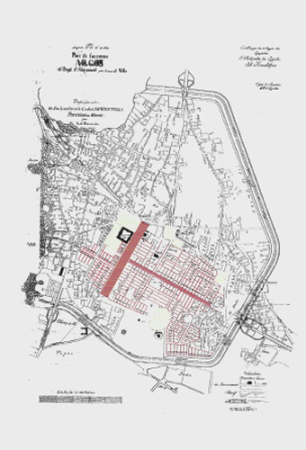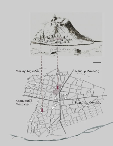 Οι μαχαλάδες του οθωμανικού Άργους, κατά το Ζεγκίνη. Χαρακτηριστικοί οι διασταυρούμενοι οδικοί άξονες. Σημειώνονται με κόκκινο τα δύο κεντρικά τζαμιά του, τα οποία διακρίνονται εμβληματικά και στην γκραβούρα του Coronelli, στην οποία αποτυπώνονται και μικρότερα οξυκόρυφα κτίρια, πιθανότατα μικρότεροι ιεροί χώροι.