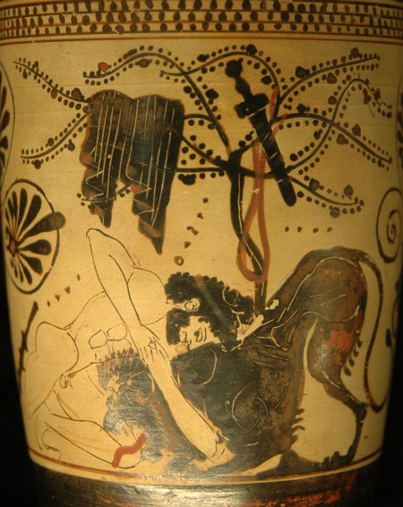 Ο Ηρακλής παλεύει με το λιοντάρι της Νεμέας. Λευκή λήκυθος του «Ζωγράφου του Διόσφου», πρώτο τέταρτο 5ου αι. π.Χ. Μουσείο του Λούβρου