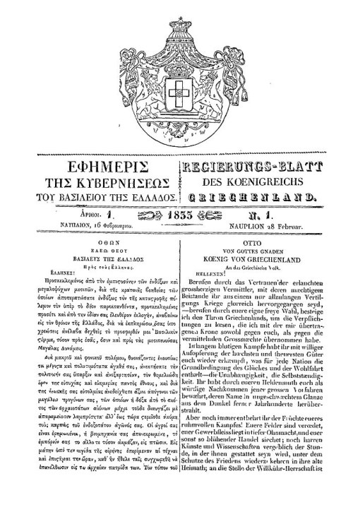 Το πρώτο Φύλλο της «Εφημερίδος της Κυβερνήσεως», Ναύπλιον 16 Φεβρουαρίου 1833.