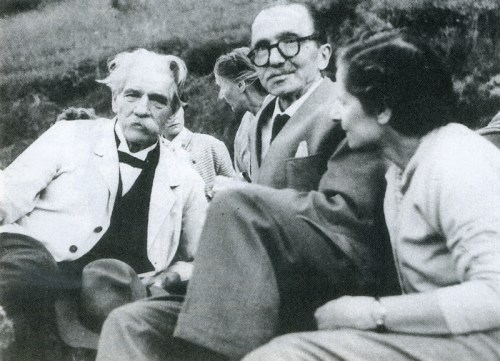 Ο Νίκος Καζαντζάκης και η Ελένη Καζαντζάκη με τον Άλμπερτ Σβάιτσερ, στο Γκρούνμπαχ, 11 Αυγούστου 1955. Δημοσιεύεται στο Περιοδικό «Δέντρο», τεύχος 155-156, Μάιος 2007.