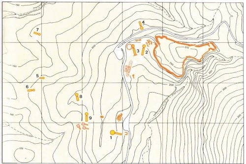 Κάτοψη της περιοχής των Μυκηνών με τους θολωτούς τάφους: 1. Θησαυρός του Ατρέα 2. Τάφος της Κλυταιμνήστρας 3. Τάφος του Αίγισθου 4. Τάφος των Λεόντων 5. Τάφος των Δαιμόνων 6. Τάφος των Κυκλώπων 7. Τάφος κάτω Φούρνος 8. Τάφος πάνω Φούρνος 9. Τάφος της Παναγίτσας