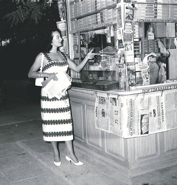 Η γαλλοτουρκικής καταγωγής ηθοποιός Υβόν Σανσόν, πρωταγωνίστρια με τον Δημήτρη Χορν στην ταινία του Γιώργου Τζαβέλλα «Μια ζωή την έχουμε», ψωνίζει σε περίπτερο της εποχής του 1958.