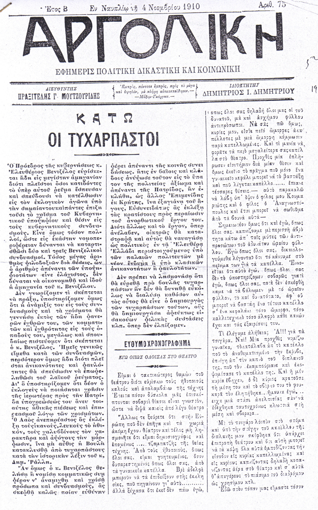 Στην «αναστατική» έκδοση με τίτλο «Αργολικόν Ημερολόγιον 1910, Εκδιδόμενον υπό του εν Αθήναις Συλλόγου των Αργείων» και τυπωμένο «Εν Αθήναις – Εκ του τυπογραφείου των Καταστημάτων Δημ. Τερζόπουλου – 1910», συναντάμε σημαντικούς λόγιους του 19ου αιώνα του Άργους αλλά και του γειτονικού Ναυπλίου, όπως ο Ιωάννης Κοφινιώτης, ο Δημήτριος Βαρδουνιώτης, ο Μιχαήλ Λαμπρυνίδης, ο Ιερέας και ιδρυτής του Συλλόγου «Ο Δαναός» Χρήστος Παπαοικονόμος και άλλους πολλούς, που οι εργασίες τους φιλοξενούνται στις 356 κιτρινισμένες και φθαρμένες από το χρόνο σελίδες του βιβλίου.