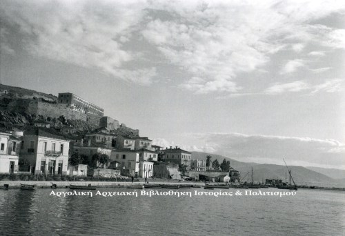 Ακρωτήριο Ναυπλίου και Αργολικός κόλπος. Φώτο: Περικλής Παπαχατζιδάκης 1930-1950 (Αρχείο Μουσείου Μπενάκη). Άκρα δεξιά τα δυο μεγάλα σπίτια που κατεδαφίστηκαν για να χτιστεί το ξενοδοχείο Αμφιτρύων το 1954.