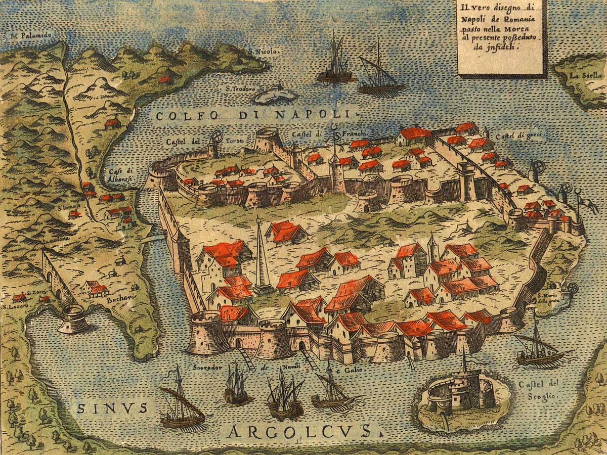 Χάρτης του Ναυπλίου του 1573; Διακρίνεται η τάφρος που χώριζε την πόλη από το βουνό του Παλαμηδιού. Δυτικά στην άκρη της τάφρου διακρίνεται η σημείωση «Case Αlbanesi». Προφανώς οικισμός στον οποίο είχαν εγκατασταθεί Αλβανοί