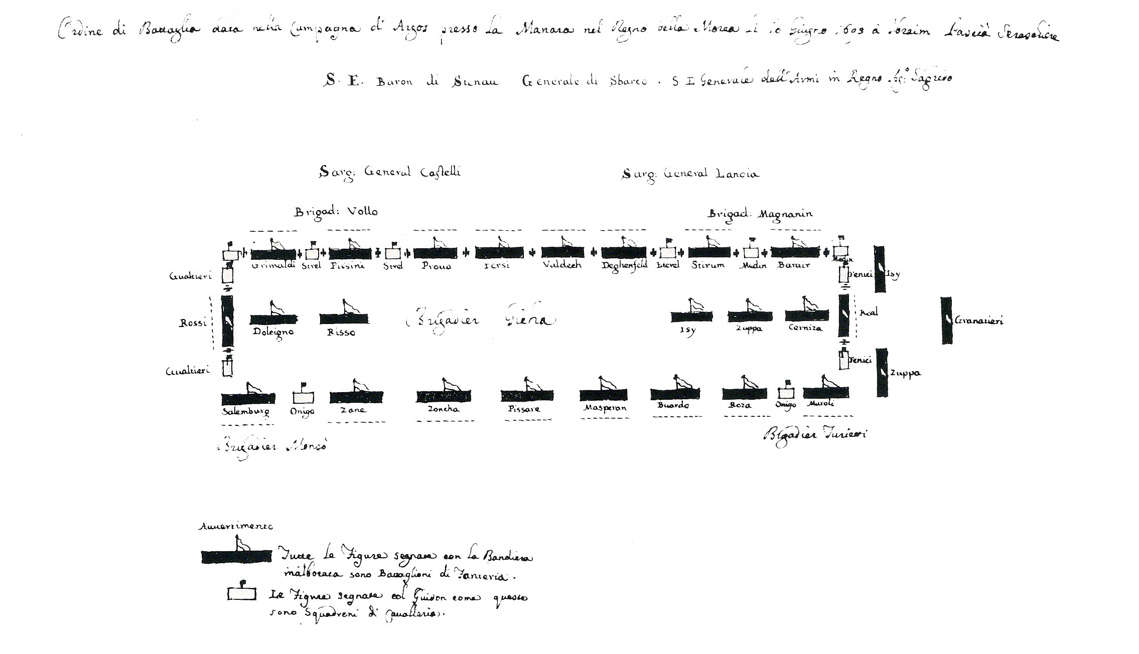 Σχέδιο της μάχης του Άργους, που έδωσαν οι Ενετοί εναντίον των Τούρκων στη θέση La Manara την 10η Ιουνίου 1695.
