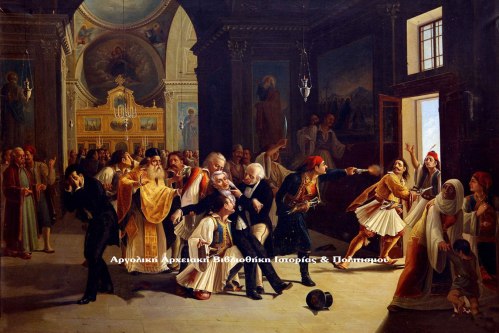 Δολοφονία του Ι. Καποδίστρια. Έργο του Χαράλαμπου Παχή το 1872. Πιθανόν το έργο να είναι μια προμελέτη. Οι διαστάσεις του είναι σχετικά μικρές και η σκηνή εκτυλίσσεται στο εσωτερικό ης εκκλησίας, έξω από την ιστορική πραγματικότητα.