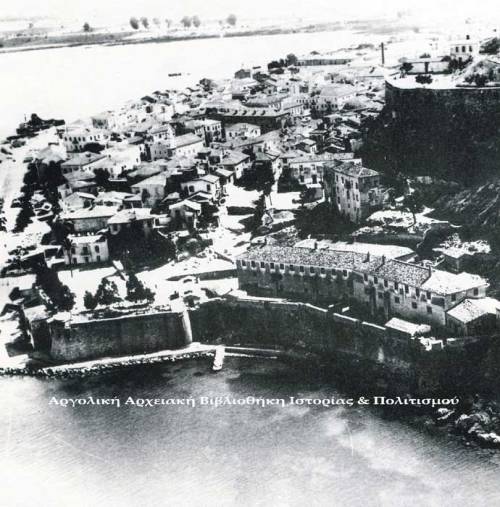Τα «Πέντε Αδέρφια» με τους διώροφους στρατώνες και το Δημοτικό Νοσοκομείο επάνω στην Ακροναυπλία, όπου σήμερα οι τουριστικές εγκαταστάσεις. Δημοσιεύεται στο: Γεώργιος Αθ. Χώρας, «Μουσική Παιδεία και ζωή στο Ναύπλιο | 18ος -20ος αιώνας», Έκδοση Δήμου Ναυπλιέων, Ναύπλιο, 1994.