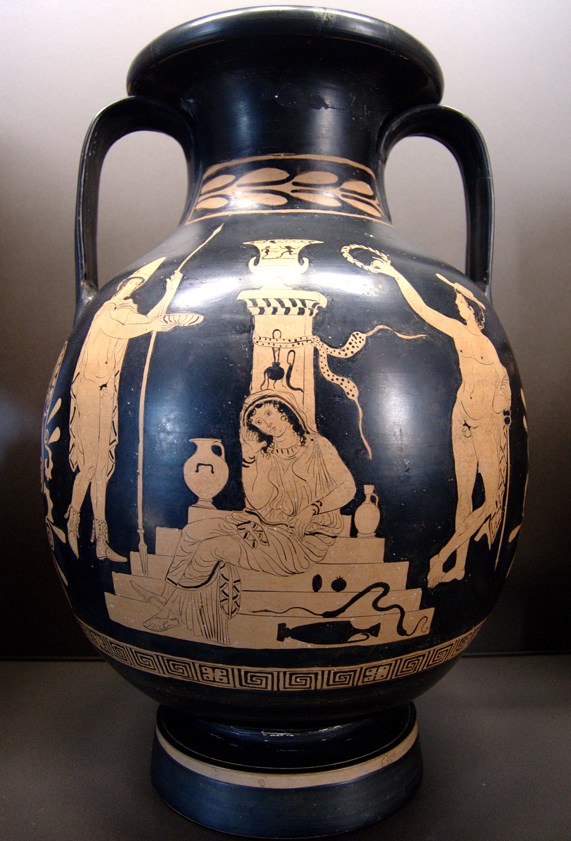 Παράσταση από λευκανική ερυθρόμορφη πελίκη του 4ου αιώνα π.Χ. όπου απεικονίζονται