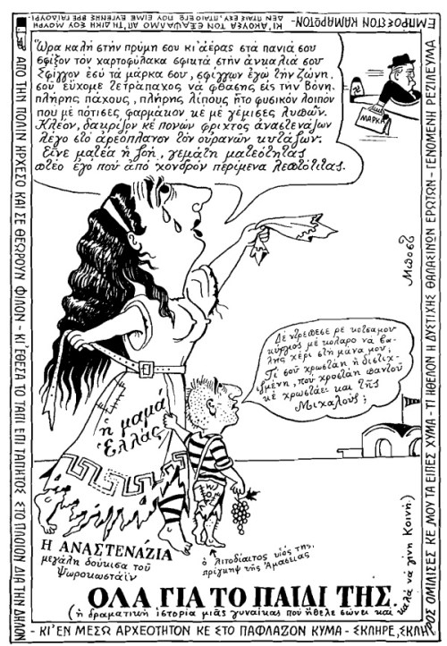 Γελοιογραφία του Μποστ, από το 1959, όπου η μαμα-Ελλάς αποχαιρετάει τον πανίσχυρο Δυτικογερμανό υπουργό Οικονομικών Λ. Έρχαρτ και ο πρωτοΠειναλέων κάνει πικρόχολο λογοπαίγνιο με την έκφραση «χρωστάει της Μιχαλούς»…