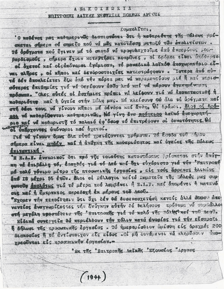 Μια ανακοίνωση- προκήρυξη του νέου δημοτικού συμβουλίου με τα πρώτα μέτρα εξυγίανσης της πόλης.