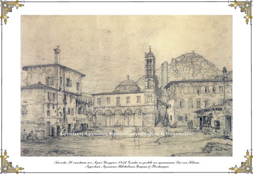 Ενετικό κτίριο δεξιά, ο Άγιος Γεώργιος και βορειότερα κτίσματα. Σχέδιο σε μολύβι του αρχιτέκτονα Λέο φον Κλέντσε (Leo von Klenze 1784-1864).