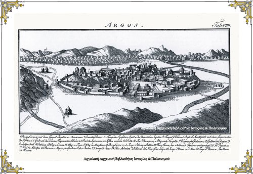 Αρχαίο Άργος. Στο χαρακτικό αυτό απεικονίζεται μια φανταστική εικόνα του αρχαίου Άργους. Ο σχεδιαστής Chaiko (1790), αγνώστων λοιπών στοιχείων, φαίνεται να έχει επισκεφτεί την Αργολίδα, όπως προκύπτει από την αρκετά, αλλά όχι εντελώς ακριβή αναπαράσταση της γενικότερης τοπογραφίας. Προφανώς, όταν αντίκρισε τα θλιβερά ερείπια της πόλης, προτίμησε να δημιουργήσει μια ρομαντική, φανταστική εικόνα του αρχαίου Άργους, βάσει των αφηγήσεων του Παυσανία στα «Κορινθιακά». Στην εικόνα καταγράφονται τρεις ποταμοί του Άργους. Ο παραπόταμος Αστερίων ( Νο24) ο οποίος ενώνεται με τον Ίναχο (Νο 20) αλλά και οι πηγές του Ερασίνου (19).