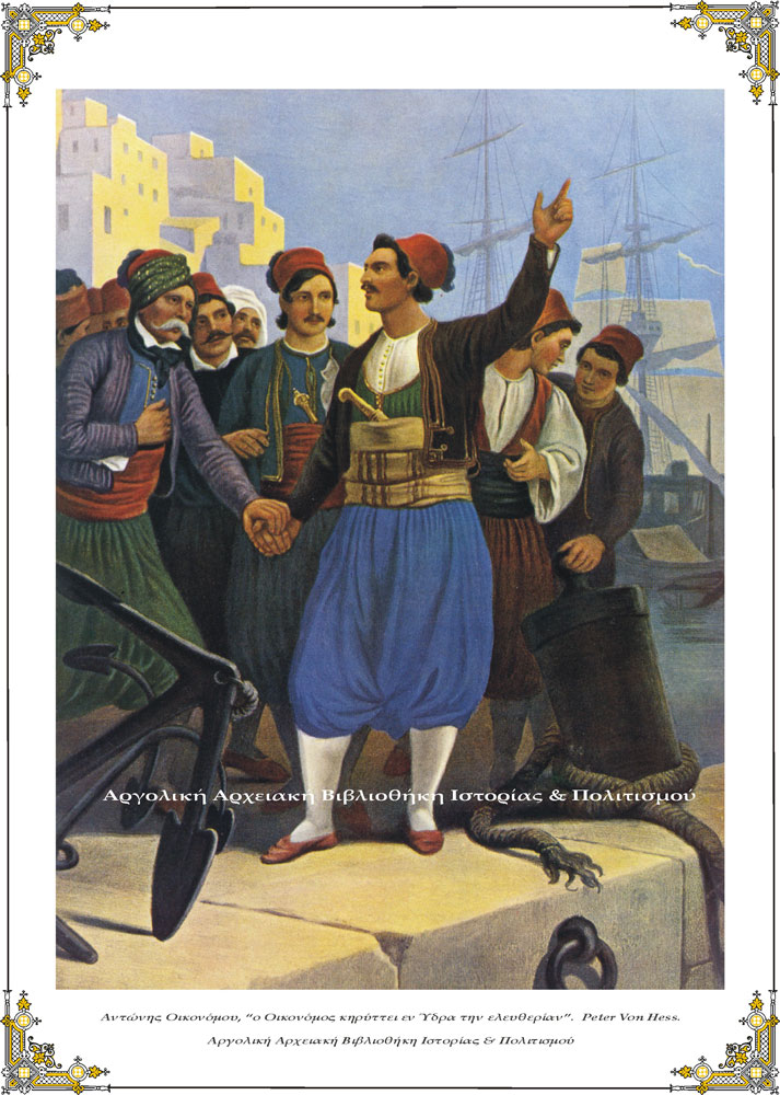 Αντώνης Οικονόμου, «ο Οικονόμος κηρύττει εν Ύδρα την ελευθερίαν». Έργο του Βαυαρού ζωγράφου Πέτερ φον Ες (Peter Von Hess).