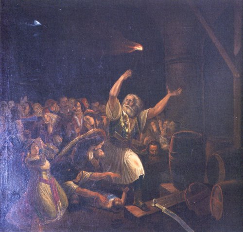 Η ανατίναξη από τον Χρήστο Καψάλη. Έργο του Θεόδωρου Βρυζάκη. Πινακοθήκη Δήμου Μεσολογγίου.