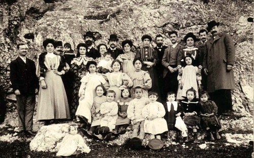 Ομαδική φωτογραφία των οικογενειών Γιουσουρούμ, Χαμπίμπ και Κοέν στο Θησείο, γύρω στο 1914. Στην πίσω γραμμή, τα πέντε παιδιά του Μποχώρ Γιουσουρούμ, Ηλίας (με μούσι και καπέλο), Χαΐμ, Ιάκωβος, Μωυσής, Νώε, με τις συζύγους και τα παιδιά τους, την τρίτη γενιά της οικογένειας. Στο κέντρο η γυναίκα του Νώε, Μαζαλτώβ (το γένος Χαμπίμπ), με τον νεογέννητο Ισαάκ στην αγκαλιά. Φωτογραφικό Αρχείο ΕΜΕ.