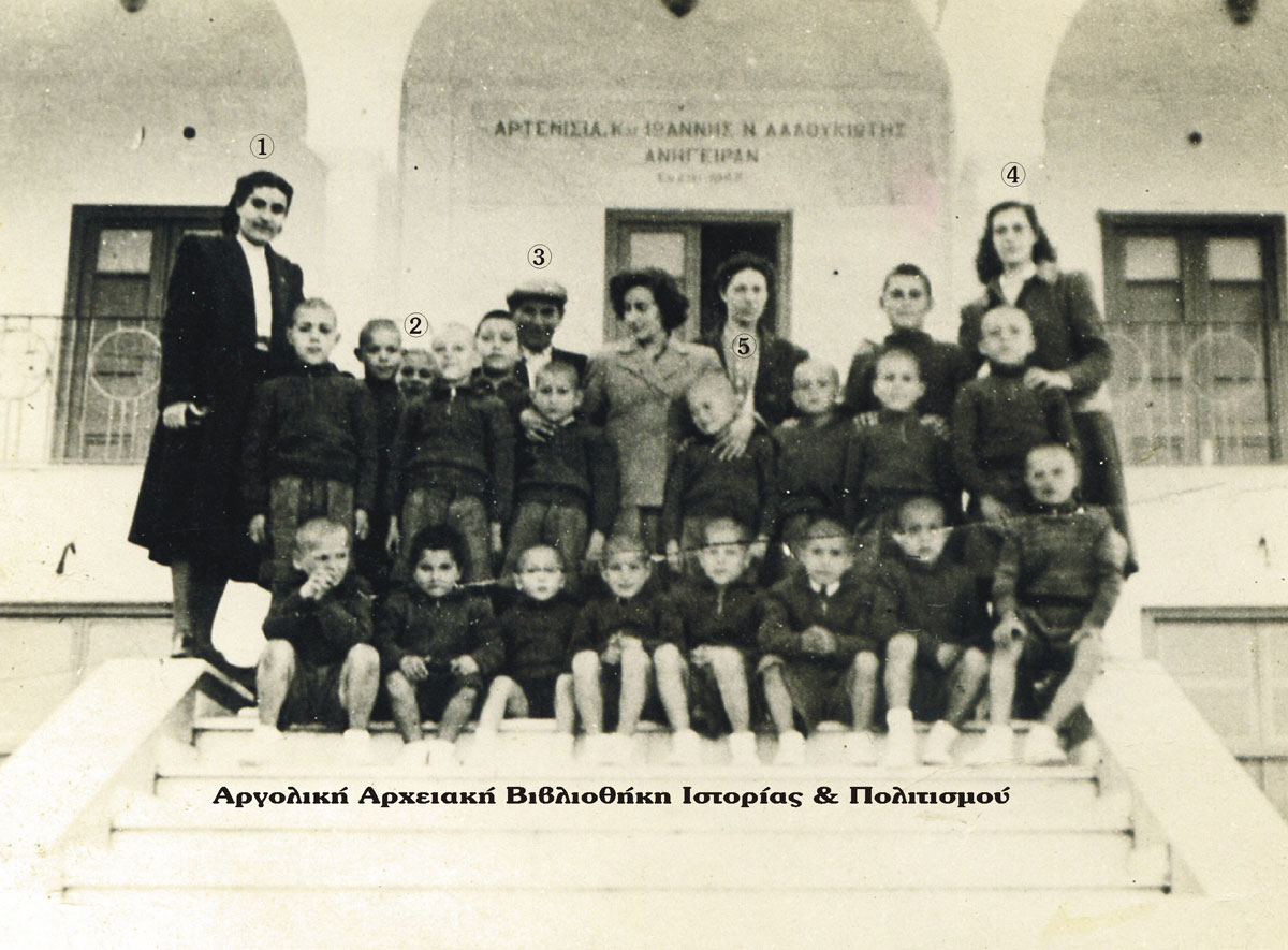 Αναμνηστική φωτογραφία (1952). 1. Μαγδαληνή Σικαλίδου –Τσιωτάκη, Δ/τρια Ορφανοτροφείου, 2. Μαριγώ Σικαλίδου, μητέρα της Δ/τριας, 3. Δημήτρης Δρίτσας από την Άρια, 4. Ελένη Κιντζίρη, 5. Αδελφή της Ελένης Κιντζίρη.